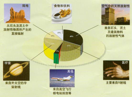 人們受到的放射性照射大約有82%來自天然環(huán)境,大約有17%來自醫(yī)療診斷,而來自其他活動大約只有1%。