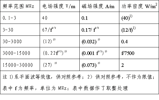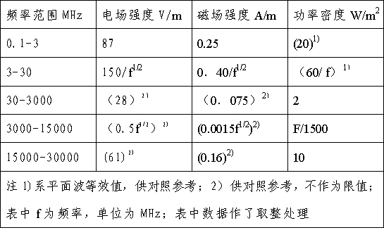 4、對(duì)于脈沖電磁波,除滿(mǎn)足上述要求外,其瞬時(shí)峰值不得超過(guò)表中1、2所列限值的1000倍。
